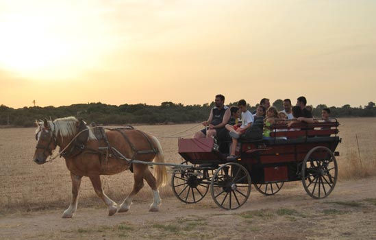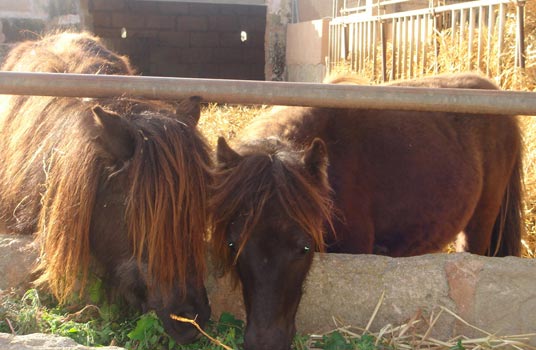 Ponys para los niños y caballo con carruaje para paseos por la finca.