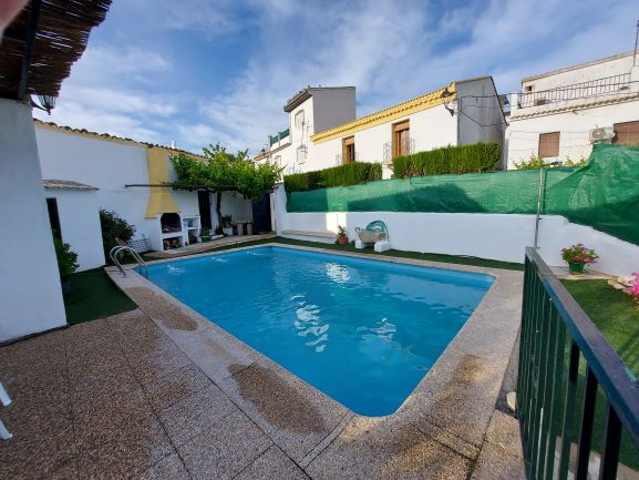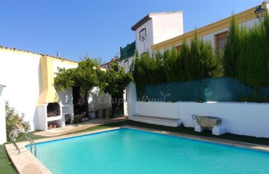 Exterior: Jardín con piscina, toldo rustico, mesas, sillas, tumbonas y barbacoa.