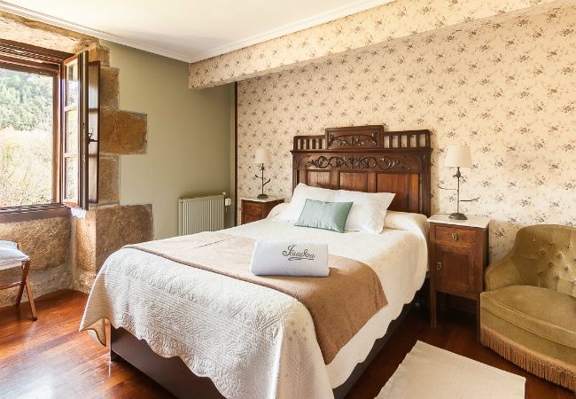 Caserio rehabilitado catalogado como patrimonio historico. Situado en un lugar tranquilo en el valle del Urola a 3km del casco urbano y ubicado en un entorno privilegiado geográficamente, ideal para su descanso y disfrute del campo. La Casa Jesuskoa dispone de siete habitaciones dobles con baño y un apartamento de cuatro plazas (ideal para dos adultos y dos niños) todos ellos equipados con calefacción centralizada, baño completo, TV, así como dos ámplios salones equipados para convenciones o disfrutar de un rato agradable al calor de la chimenea, Wi-Fi. Servicio de Bar, tambien se sirven cenas previo aviso a los huespedes. La casona fue construida junto a una antigua tejería, por los Jesuitas, como punto de desembarque de materiales para posteriormente ser transportados por los caminos en carros hasta Azpeitia para construir la Basílica de Loyola. Dicha construcción típica de la arquitectura Vasca de la época del Siglo XVIII construida en piedra y pilares de madera y Roble.Mas info. en http://www.jesuskoa.net