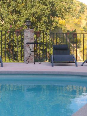 En el exterior encontramos tres patios amplios y realizados igualmente en piedra en su conjunto, el lateral tiene zona de descanso frente al río con mesa, bancos y zona de barbacoa, desde el se accede al parking del alojamiento y en el otro extremo a la casa por la cocina. En el patio principal se encuentra la entrada de la casa con un paño en canto rodado que dibuja una maravillosa granada, símbolo de nuestra provincia. Desde este patio accedemos al solarium y la piscina desde donde las vistas al río y al corredor verde son una delicia. La piscina tiene una forma triangular con bordes redondeados original e incrustada en la montaña haciéndose parte del entorno.