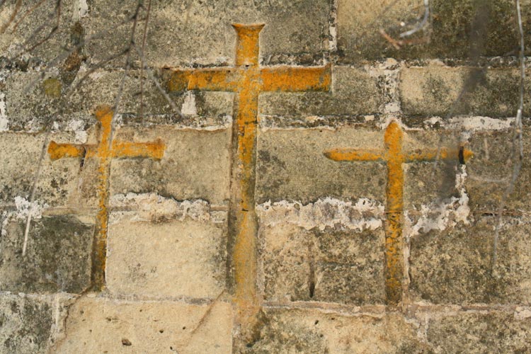 En el exterior se pueden apreciar en los muros del bastión noroeste que aun resisten al paso del tiempo, tres cruces grabadas sobre la piedra. Estas inscripciones, según la leyenda, fueron realizadas a punta de cuchillo el mismo día de la conquista de la fortaleza por el Rey Fernando y el Gran Capitán, el 26 de junio de 1486, algo imposible ya que estos muros se construyeron con posterioridad a la conquista.
