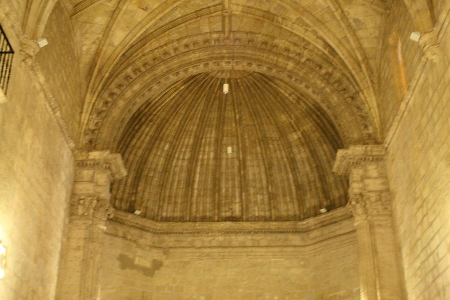 A la izquierda de la capilla mayor está la sacristía y a su lado la entrada hacia la torre del campanario con sus 477 peldaños de estrecha escalera de caracol hasta llegar arriba.