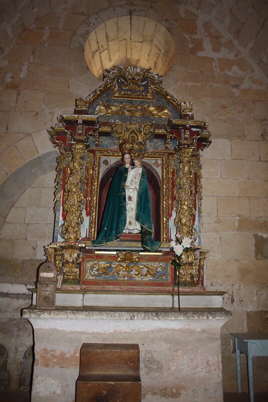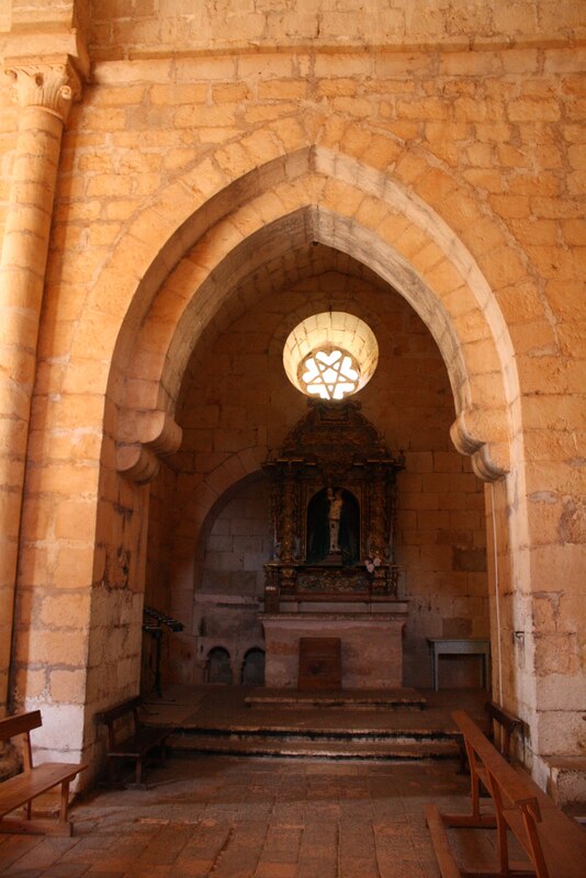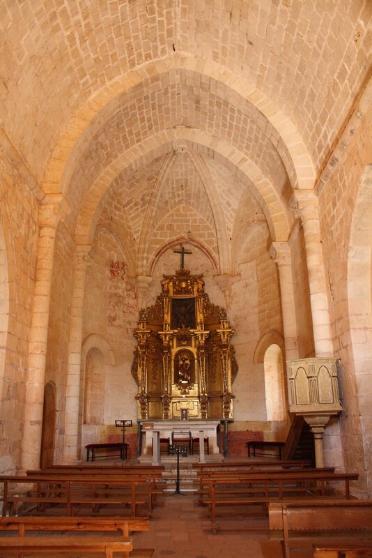 Su arco triunfal es apuntado, ligeramente más elevado que los fajones de la nave que descansan sobre columnas adosadas con capiteles decorados con motivos vegetales muy esquemáticos.