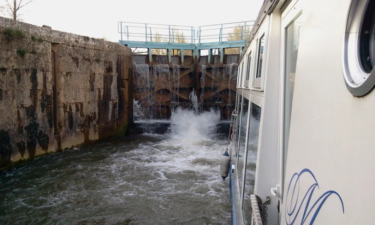 En concreto, visitamos la 6ª esclusa, perteneciente al ramal norte entre Alar del Rey y Herrera de Pisuerga. Restaurada y acondicionada para la navegación, esta esclusa nos permitió embarcarnos en el barco Marqués de la Ensenada, en un paseo tranquilo y sosegante que nos mostró la belleza serena del canal y su entorno natural. A lo largo del recorrido, observamos las antiguas edificaciones que bordean el canal, como en la 4ª esclusa, donde el viejo edificio de la central eléctrica y los edificios adyacentes han sido rehabilitados como Casas Rurales La Cuarta Esclusa y El Canal, integrando patrimonio y alojamiento rural.